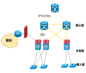 ? ? 大型企業(yè)網(wǎng)絡系統(tǒng)具有用戶分布范圍廣、需求多樣化、網(wǎng)絡系統(tǒng)可靠性和擴展能力要求高等特點。為了滿足大型企業(yè)網(wǎng)絡系統(tǒng)的上述要求,按照模塊化和層次化的方式進行設計,整個網(wǎng)絡系統(tǒng)劃分為核心層、分布層和接入層三個層次,采用這種設計方法可以保證整個網(wǎng)絡系統(tǒng)的高性能、高可靠性和好的系統(tǒng)擴展性。